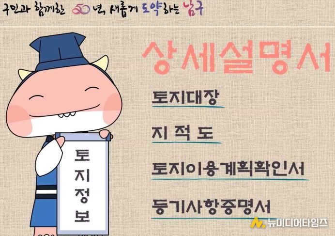 남구는 개청 50주년을 맞아 구민들이 혼동하기 쉬운 토지의 기본 개념과 주요 용어를 실제 화면 예시와 함께 설명하고, 인공지능(AI) 음성을 활용해 초보자도 쉽게 이해할 수 있도록 구성했다.