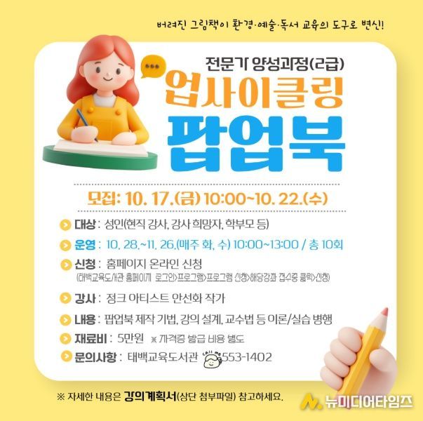 강원도교육청 태백교육도서관은 10월 28일부터 11월 26일까지 지역 내 지속 가능한 친환경 교육문화 확산 과 환경교육 전문 인력 양성을 위해 ‘2025년 업사이클링 팝업북 강사 자격과정’을 운영한다.