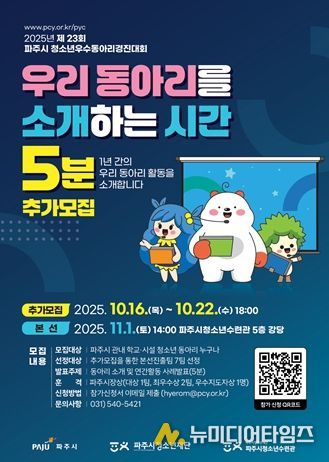 (재)파주시청소년재단 파주시청소년수련관은 오는 10월 16일부터 10월 22일까지 “제23회 파주시 청소년우수동아리경진대회”의 참가 동아리를 모집한다.