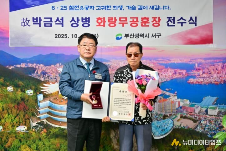 부산광역시 서구는 지난 16일, 6·25전쟁에 참전해 공을 세운 故박금석 님의 조카 박정진 씨에게 화랑무공훈장을 전수했다.