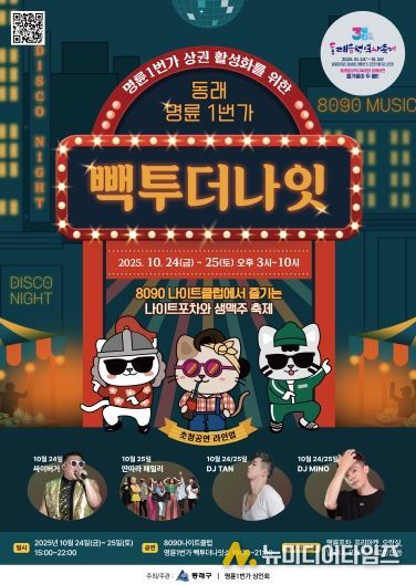 부산 동래구는 오는 10월 24일부터 25일까지 이틀간 오후 3시부터 10시까지 명륜1번가 일대에서 ‘명륜1번가 나이트 페스티벌(빽투더나잇)’을 개최한다고 밝혔다.