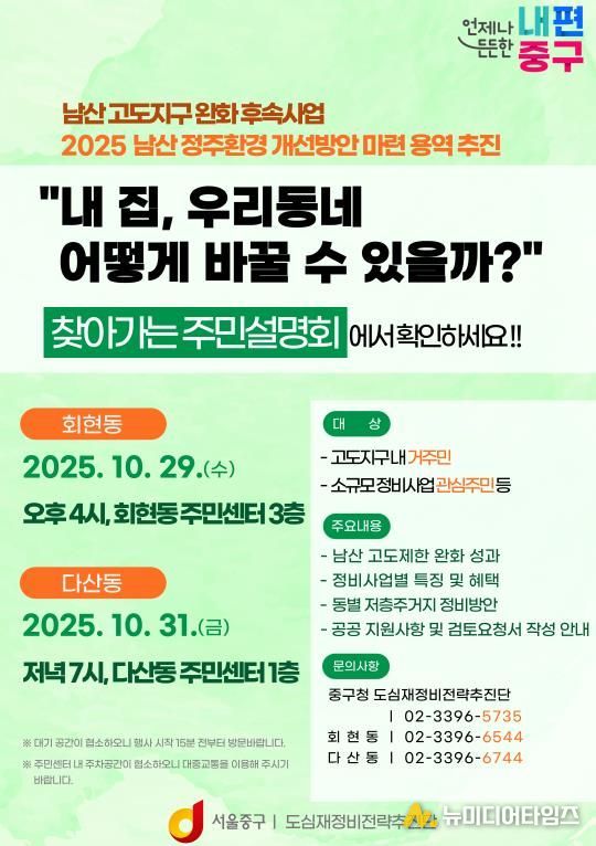 서울 중구가 오는 10월 29일과 31일 회현동과 다산동 주민센터에서 '찾아가는 주민설명회'를 열고 남산 고도지구 완화 후속사업과 남산 정주환경 개선방안을 주민들과 공유한다.