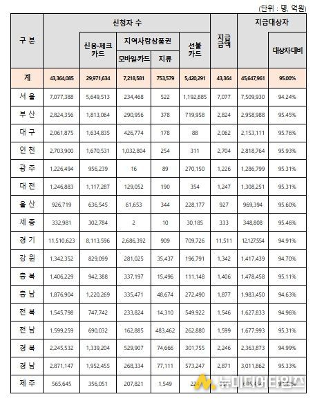 2차 민생회복 소비쿠폰 신청·지급 개시 이후 4주간(9.22(월)~10.19(일)) 지급대상자의 95.0%인 4천336만 명이 신청하고 4조 3천364억 원이 지급되어, 추석 연휴 간 오프라인 신청이 불가능했음에도 불구하고, 대다수 국민들이 소비쿠폰을 신청·지급받은 것으로 나타났다.(10.19. 24시 기준)