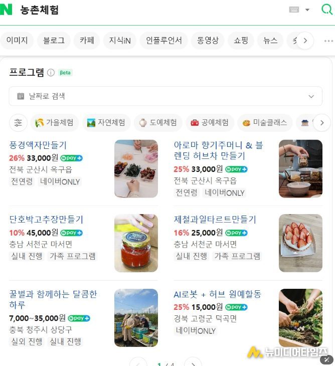 네이버 검색창에 ‘농촌체험’을 입력하면 화면 중간에 통합 정보창 ‘프로그램’이 보인다. 여기서 공기정화식물 화분 만들기, 제철 농작물 수확, 동물교감, 곤충 표본 체험 등 전국 42개 농장에서 운영 중인 우수 프로그램 정보를 확인, 예약할 수 있다.