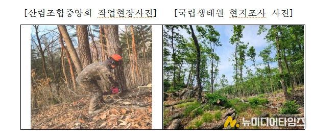 또한, 작업현장 사진과 현지조사 사진을 비교한 결과, 큰나무 위주의 간벌로 인해 식생이 단순화되고 산림 구조가 훼손된 정황이 확인됐다.