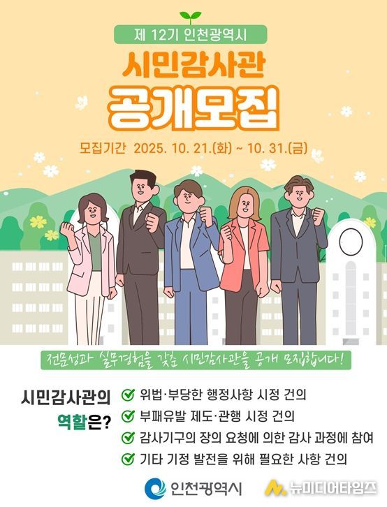 인천광역시는 제12기 시민감사관을 10월 21일부터 10월 31일까지 공개모집한다고 밝혔다.