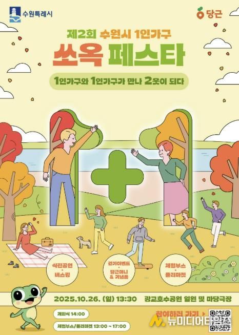 오는 26일 오후 수원 광교호수공원에 가면 시민 누구나 호숫가에서 걷기 운동을 하며 이웃을 만들 수 있다. ‘제2회 수원시 1인가구 쏘옥 페스타 1+1’이 1인가구와 시민들을 연결하는 폭넓은 소통의 장을 마련한다. 1인가구에 도움이 되는 다양한 정보를 얻고, 1인가구라서 느끼는 고민을 서로 나누고, 취미가 맞는 1인가구끼리 새 친구가 되는 기회다. 운이 좋으면 1만원의 당근머니도 받게 되는 가을 소풍을 즐겨보자.