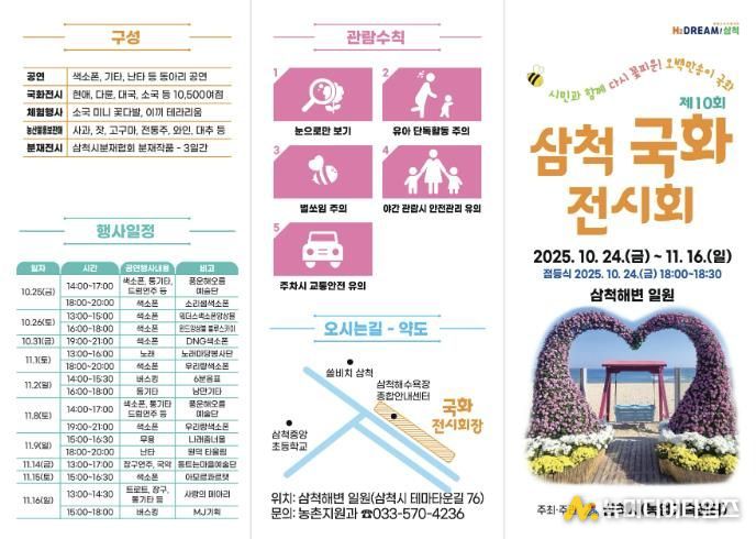시 관계자는 “올해도 삼척해변에서 시민과 관광객들이 함께 즐길 수 있는 국화전시회를 마련했다”며 “가족, 연인, 친구와 함께 방문해 가을의 향기 속에서 아름다운 사진과 추억을 남기시길 바란다”고 전했다.
