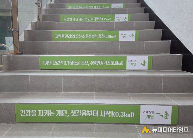 계단 디딤면에는 ‘건강을 지키는 계단, 첫걸음부터 시작’, ‘꾸준한 계단 걷기로 근력 강화’, ‘집중력 향상에 좋은 건강계단’ 등 건강 문구 띠지를 부착했으며 1층 계단 벽면에는 그래픽 디자인을 적용하고 엘리베이터 문에는 계단 이용을 유도하는 안내 스티커를 설치하여 이용자들의 자발적인 참여를 유도했다.