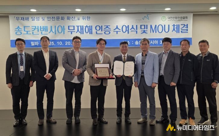 `인천경제자유구역청과 인천관광공사(사장 백현)가 운영하는 송도컨벤시아는 494일 동안 산업재해 없는 안전한 사업장 운영 성과를 달성해, 20일 대한산업안전협회로부터 무재해 인증을 획득했다.