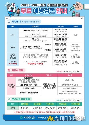 거제시는 65세 이상 어르신 대상으로 겨울철 호흡기 감염병 예방을 위해 10월 15일부터 2025-2026절기 인플루엔자(독감)&코로나19 무료 예방접종을 시작했다.