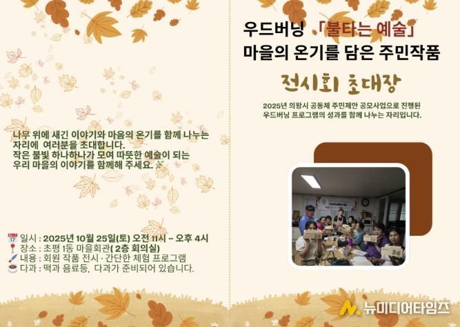 의왕시는 마을공동체 자강불식이 오는 10월 25일 초평1동마을회관(윗새우대북길 14)에서'우드버닝, 불타는 예술'작품전시회를 개최한다고 밝혔다.