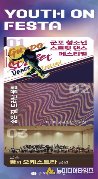 군포문화재단은 오는 25일, 오후 12시 30분부터 4시까지‘YOUTH ON FESTA’를 개최한다. 군포문화예술회관 야외공연장·전시실 일대에서 지역 청년, 청소년 대상 댄스 페스티벌·전시·오케스트라 공연 등 3개 행사를 통합 개최한다.