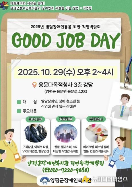 대한불교조계종사회복지재단이 운영하는 양평군장애인복지관은 오는 29일 오후 2시부터 4시까지 용문다목적청사 3층 강당에서 발달장애인의 직업 탐색 기회를 지원하기 위한 직업박람회 ‘GOOD JOB DAY’를 개최한다.