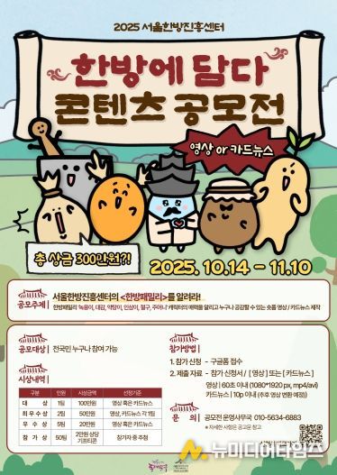 서울 동대문구는 한방산업특구 서울약령시에 위치한 서울한방진흥센터(서울약령시한의약박물관)가 ‘2025 한방에 담다 콘텐츠 공모전’을 개최한다고 밝혔다.