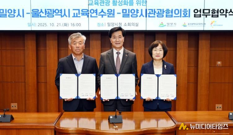 울산교육연수원은 21일 밀양시청 소회의실에서 경남 밀양시, 밀양시관광협의회와 지역 자원을 활용한 현장 체험 연수 지원 등을 내용으로 하는 업무협약을 체결했다.