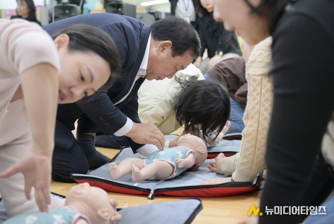 최민호 세종특별자치시장이 21일 종촌동 육아종합지원센터에서 ‘찾아가는 현장소통’을 열고 영유아 학부모 40여 명과 함께 심폐소생술을 재숙지하고 응급대처의 중요성을 공유했다.
