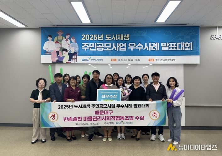 해운대구 반송솔찬 마을관리 사회적협동조합(이사장 강선희)이 17일 부산도시공사가 주최한 ‘도시재생 주민공모사업 우수사례 발표대회’에서 최우수상을 받았다.