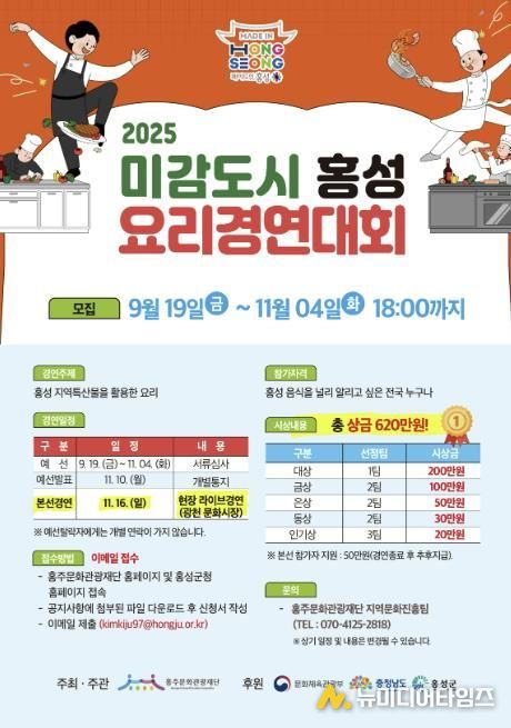 홍성군은 내달 4일까지 ‘2025년 미감도시 홍성 요리경연대회’의 참가자를 추가 공개 모집한다고 밝혔다.