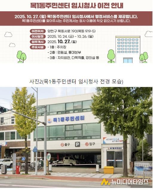 임시청사는 목1동 기존 청사 바로 옆 건물인 목동서로 190(목동 919-5)에 위치하며, ▲1층 주차장 ▲2층 민원실 및 동대본부 ▲3층 자치회관으로 운영된다.