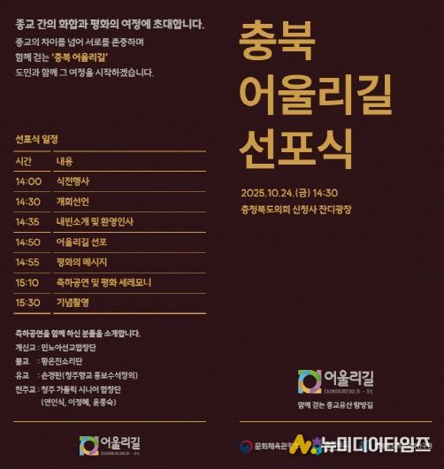 충북도 관계자는 “이번 선포식이 종교 간 평화와 문화적 공존을 향한 새로운 출발점이 되길 기대한다”며, “도민 모두가 함께 걷고 소통하는 어울림의 길이 지속적으로 확산되길 바란다”고 밝혔다.