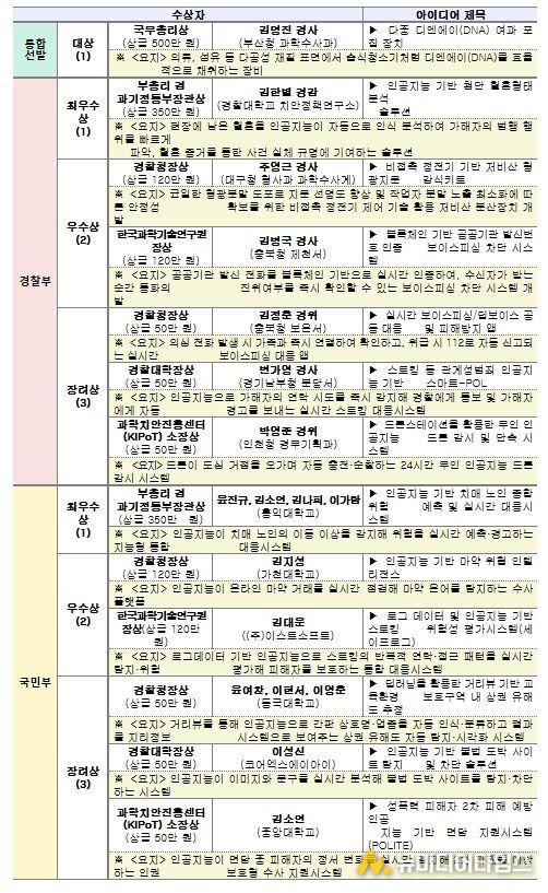 경찰부 최우수상은 ‘인공지능 기반 첨단혈흔형태분석 솔루션’을 제안한 치안정책연구소 김한별 경감, 국민부 최우수상은 ‘인공지능 기반 치매노인 위험 예측‧대응시스템’을 제안한 홍익대학교 윤진규 등 4명이 수상했다.