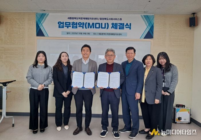 충청북도사회서비스원(원장 이장희)과 세종충북도박문제예방치유센터(센터장 김경진)는 2025년 10월 28일 오전 11시, 세종충북도박문제예방치유센터 회의실에서 도민의 정신건강 증진 및 삶의 질 향상과 사회서비스 협력체계 강화를 위한 업무협약(MOU)을 체결했다.