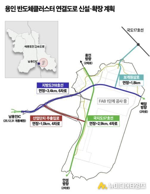 시는 대한민국 반도체 메가 클러스터의 핵심 시설인 용인반도체클러스터의 원활한 교통 여건을 조성하기 위해 현재 2차로인 지방도 318호선을 6차로로 확장(3.4km)하는 것을 비롯해, 국지도 57호선 2차로→4차로 확장 및 선형 변경(2.9km), 보개원삼로 2차로→4차로 확장(1.8km), 산업단지 주출입도로 4차로 신설(1km) 등의 공사를 진행하고 있다.