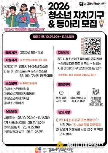 (재)김포시청소년재단에서 2026년 한 해 동안 김포시 청소년 수련시설을 함께 이끌어갈 청소년 자치기구 및 동아리 참여 청소년을 오는 10월 29일부터 11월 16일까지 모집한다.