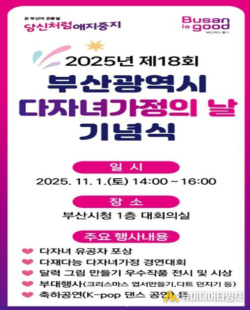 부산시는 내일(11월 1일) '부산시 다자녀가정의 날'을 맞아 오후 2시부터 4시까지 시청 1층 대회의실에서 '제18회 다자녀가정의 날 기념행사'를 개최한다고 밝혔다.