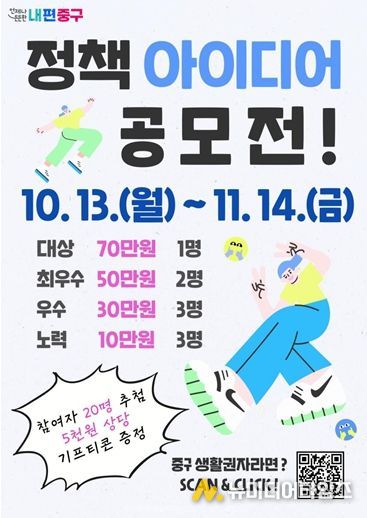 서울 중구가 11월 14일까지 '2025 하반기 정책 아이디어 공모전'을 연다. 공모전은 중구민과 중구 생활권자라면 누구나 참여할 수 있다.