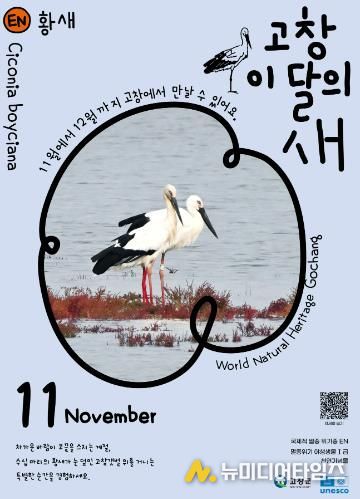고창군이 11월 ‘고창갯벌 이달의 새’로 멸종위기 철새인 황새(학명 Ciconia boyciana)를 선정하고, 희귀 철새 보호와 갯벌 생태계 보전의 중요성을 알리는 캠페인을 이어간다.