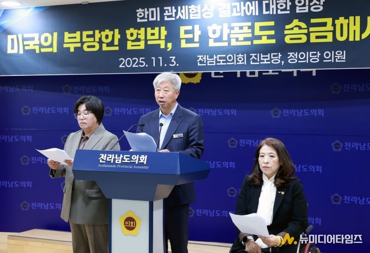 전라남도의회 박형대의원(진보당ㆍ장흥1)은 3일 도의회 브리핑룸에서 최근 타결된 ‘10.29 한미 관세협상’에 대한 진보당, 정의당 공동 기자회견에 참석해 공동 입장을 발표했다.