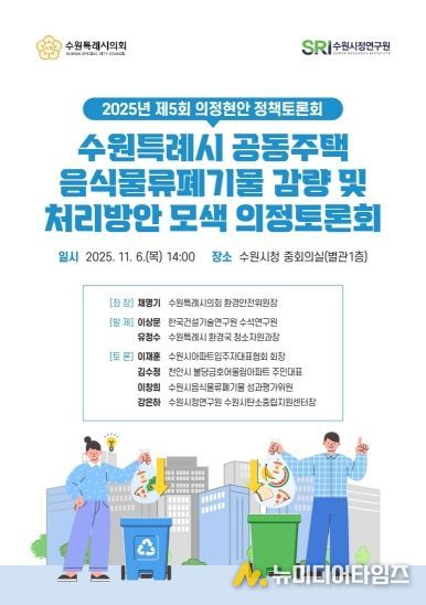 수원특례시의회 환경안전위원회는 11월 6일, 오후 2시, 수원시청 별관 1층 중회의실에서 ‘공동주택 음식물류폐기물 감량 및 처리방안 모색을 위한 의정토론회’를 개최한다고 밝혔다.
