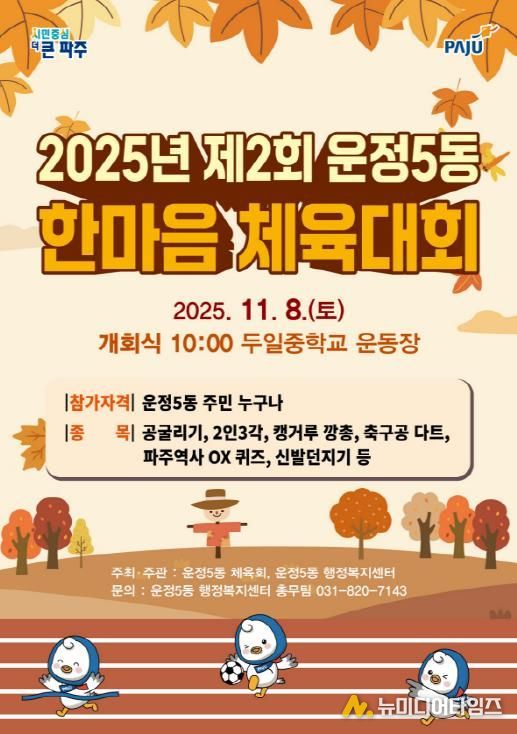 파주시 운정5동은 오는 11월 8일 토요일 두일중학교에서 녩년 제2회 한마음 체육대회’를 개최한다.