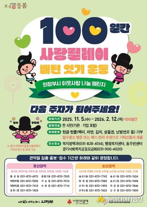 의정부시는 연말연시를 맞아 도움이 필요한 이웃들에게 사랑의 손길을 나누는 이웃사랑 나눔 챌린지 ‘100일간 사랑릴레이 배턴 잇기’를 11월 5일부터 내년 2월 12일까지 100일간 진행한다.