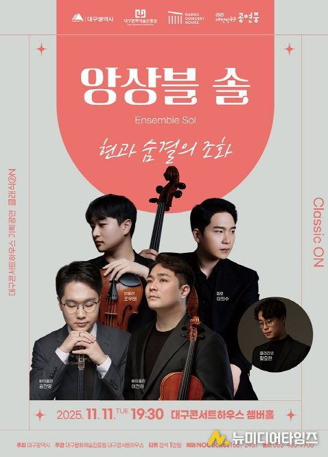 대구콘서트하우스의 지역예술가를 지원하는 시리즈 공연인 ‘클래식 ON’의 11월 공연은 청년 음악가로 구성된 현악 4중주단인 ‘앙상블 솔’의 무대이다.