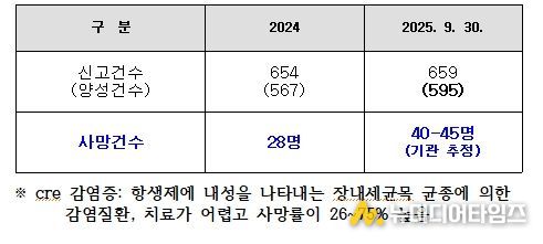 권혁열 의원이 강원도로부터 제출받은 감염병 검사 실적 및 양성 건수 자료에 따르면, 격리가 필요한 제2급 감염병인 CRE(장내세균목 균종에 의한 감염질환) 감염 사례가 최근 2년간 연평균 581건에 달했으며, *사망자 수도 2024년 28명(공식 집계)*에서 *2025년 9월 기준 40명(기관 추정)*으로 크게 증가한 것으로 나타났다. (※ 25년 사망자는 다음 해 최종 사인 판정 후 확정됨.)
