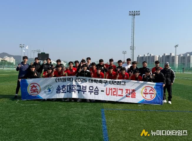 이태우 감독이 이끄는 송호대 축구부는 지난달 31일 충북 음성생활체육공원에서 열린 2025 KUSF 대학축구 U-리그2 최종전 강동대와 경기에서 3대 1로 승리해 우승과 함께 U-리그1승격을 확정지었다.