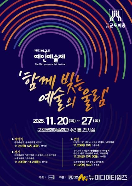 2025년 제22회 군포 예인예술제가 11월 20일부터 27일까지 군포문화예술회관 전시실과 수리홀에서 8일간 진행된다.