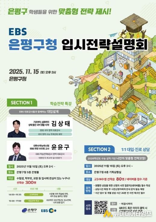 특강은 이날 오후 2시부터 5시까지 은평구청 5층 은평홀에서 진행된다. 특강에서는 현재 고2 학생 300명을 대상으로 EBS 대표강사 2명이 수능과 내신 국어 학습전략을 설명하고 2027학년도 대입 지원 전략을 안내한다.