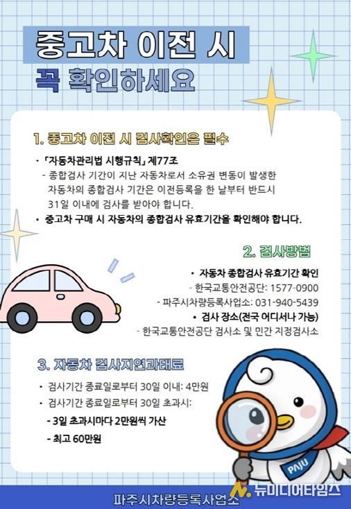 이호명 파주시 차량등록사업소장은 “자동차의 안전과 환경을 지키기 위한 종합검사는 선택이 아닌 의무”라며, “중고차 이전 후 31일 이내에 반드시 검사를 받아 불이익을 받지 않도록 시민 여러분의 적극적인 협조를 부탁드린다”라고 말했다.