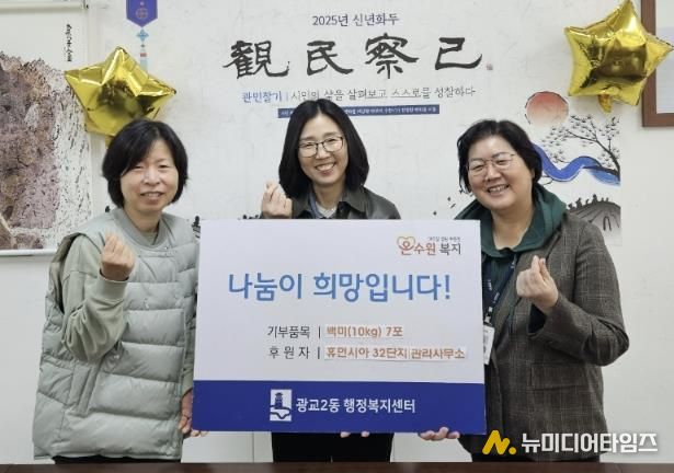 임지희 관리사무소장은 “단지 내 어려운 이웃들을 생각하며 작게나마 힘이 되고 싶었다”며 “이 백미가 추운 겨울을 앞두고 따뜻한 식탁 위에 놓여 작은 희망이 되길 바란다”고 말했다.
