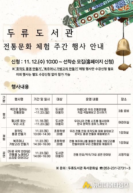 대구두류도서관은 지역 주민을 대상으로 오는 11월 18일부터 23일까지 ‘전통문화 체험 주간’ 행사를 운영한다고 밝혔다.