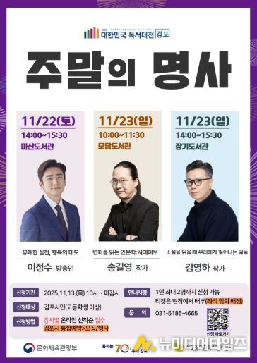 김포시는 ‘2025 대한민국 독서대전’의 일환으로 시민이 책과 인문 강연을 통해 삶의 방향을 모색할 수 있는 인문 강연 『주말의 명사』를 오는 11월 22일부터 23일까지 3개 도서관에서 진행한다.