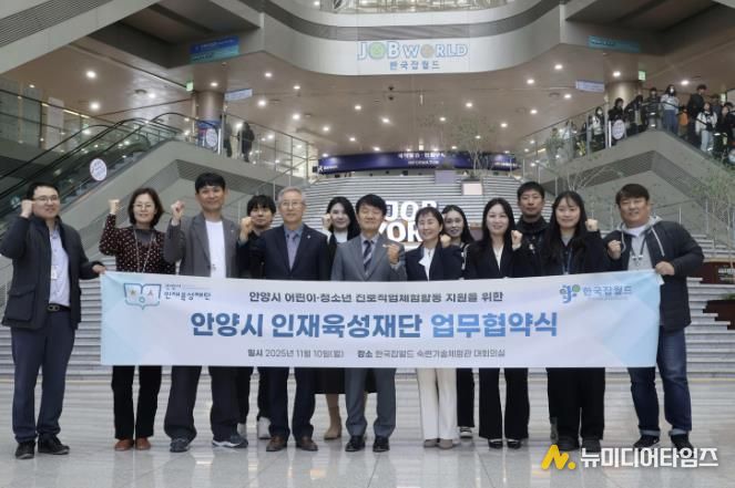 안양시 인재육성재단은 10일 한국잡월드 숙련기술체험관 대회의실에서 직업진로체험 대표기관인 한국잡월드와 업무협약을 체결했다고 11일 밝혔다. 이번 협약은 안양시 어린이·청소년의 다양한 진로·직업체험 및 교육지원을 위해 양 기관이 상호협력을 강화하고자 추진됐다.