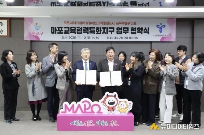 마포구청 중회의실에서 열린 이번 협약식은 마포구와 교육청의 협력 체계 구축과 운영 발전을 위한 업무 협약을 맺기 위해 열렸으며, 정근식 서울특별시교육청 교육감과 주윤숙 서울특별시서부교육지원청 교육지원국장 등이 함께했다.