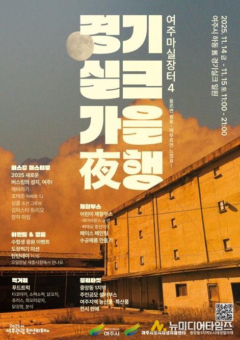 여주시는 오는 11월 14일부터 15일까지 이틀간 여주 경기실크 일원(여주시 하동 123-6번지)에서 '여주마실장터4 가을야행'을 개최한다고 밝혔다. 이번 행사는 '2025 새로운 버스킹의 성지, 여주!'라는 슬로건 아래, 깊어가는 가을밤의 정취를 더할 버스킹 페스티벌과 함께 다채로운 마켓과 체험을 선보일 예정이다.