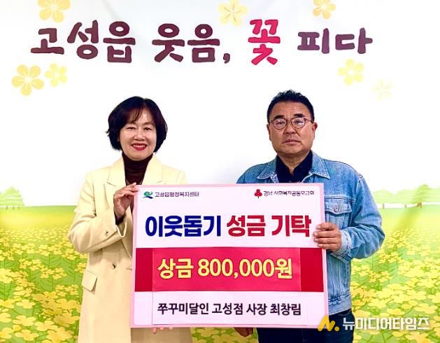 고성군 고성읍는 쭈꾸미달인 고성점 최창림 사장이 11월 11일, 관내 어려운 이웃들에게 전달해달라며 ‘전국노래자랑 고성편’에서 인기상 수상 상금 80만 원을 저소득층을 위해 기탁했다.
