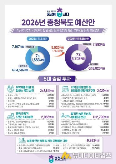 충청북도는 민선8기 도정 비전 완성 및 충북형 혁신 일자리 창출, 도민 생활 안정 등을 위해 2026년도 예산안을 편성하여 11월 11일 충청북도의회에 제출했다.